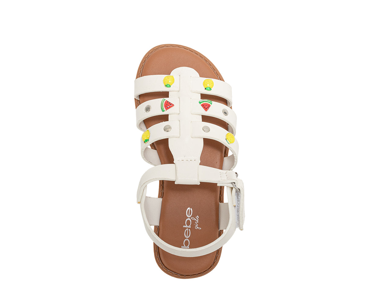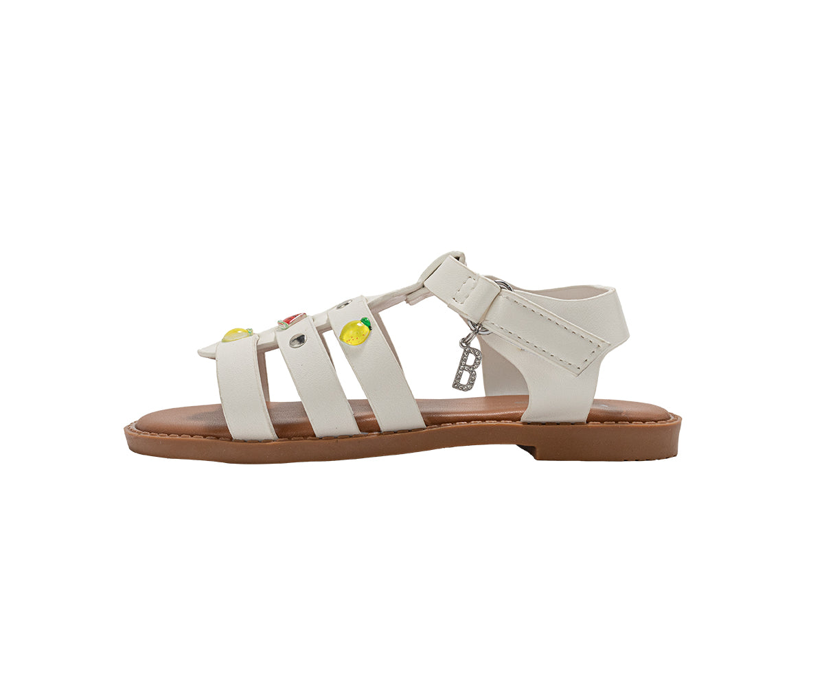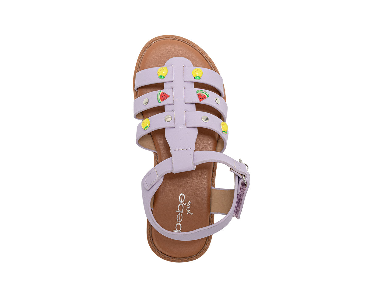 These Bebe Girls Fashion Sandals are designed to bring playful detail and comfort to any warm-weather outfit. Made as flat summer sandals for girls, they feature colorful fruit studs, stylish metal accents, and a signature hanging B charm for a fun, fashionable look. The lightweight construction helps keep feet comfortable throughout the day, while the adjustable ankle strap provides a secure and easy fit. Perfect as girls summer shoes, these sandals are ideal for everyday wear, vacations, beach days, parties, and special occasions. A stylish and comfortable addition to any girl’s footwear collection.