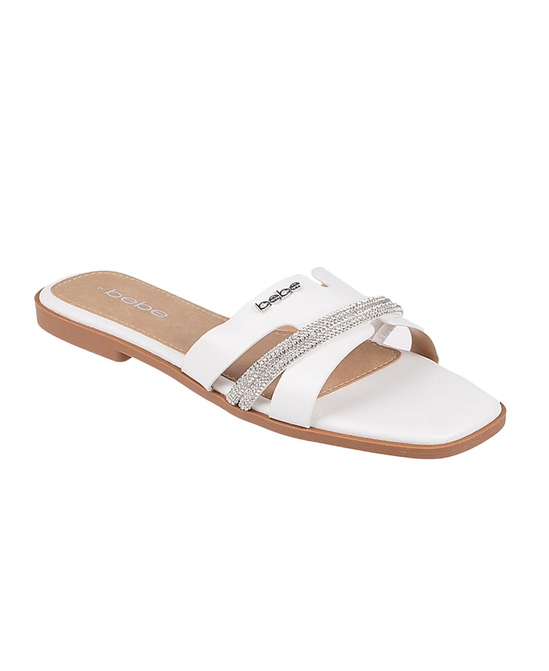 Step up your style with these women's fashion sandals. They feature sparkling rhinestone details and a "bebe" rivet for a touch of glam. The flat design makes them lightweight and easy to wear all day. Available in white and cognac, they go with any outfit. Perfect for casual or dressy looks!