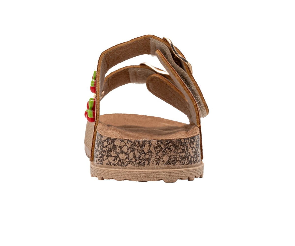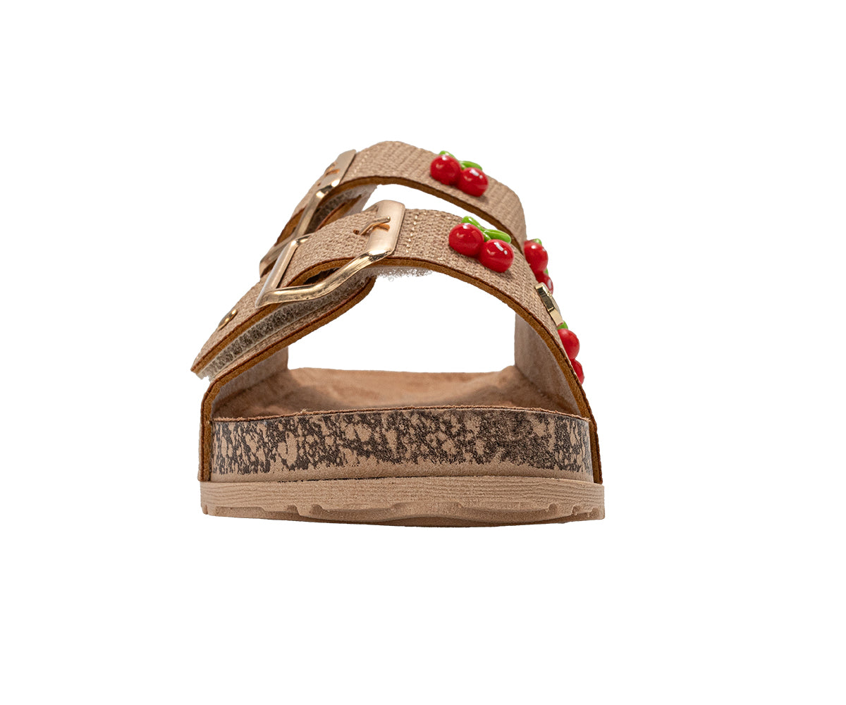 Sweeten her summer style with these bebe Girl's sandals. Designed for easy wear, the comfortable slide-on style is secured with an adjustable buckle strap. The star detail is the playful cherry charm accent, adding a fun, fruity flourish to this essential warm-weather look.