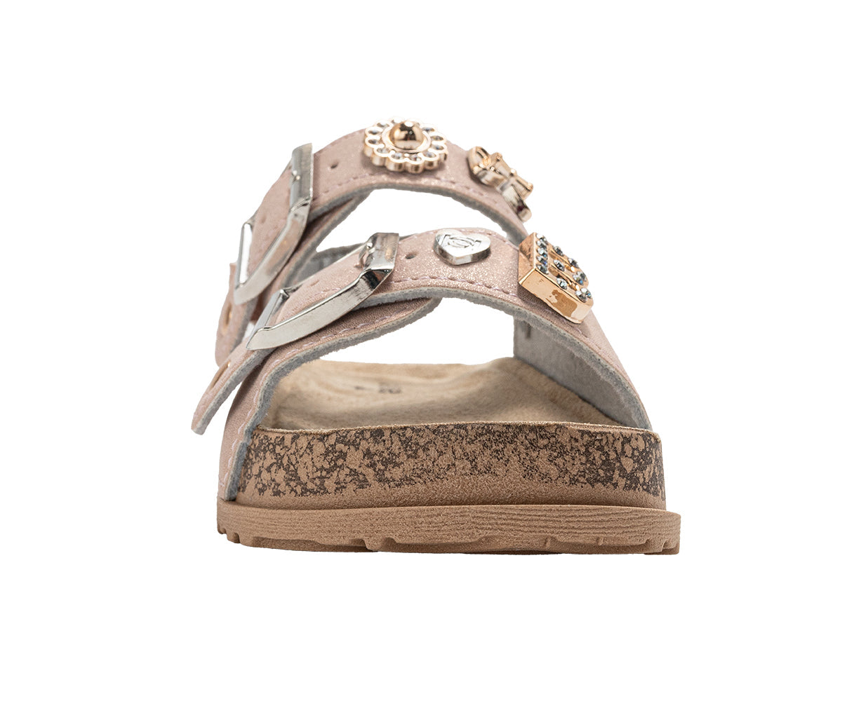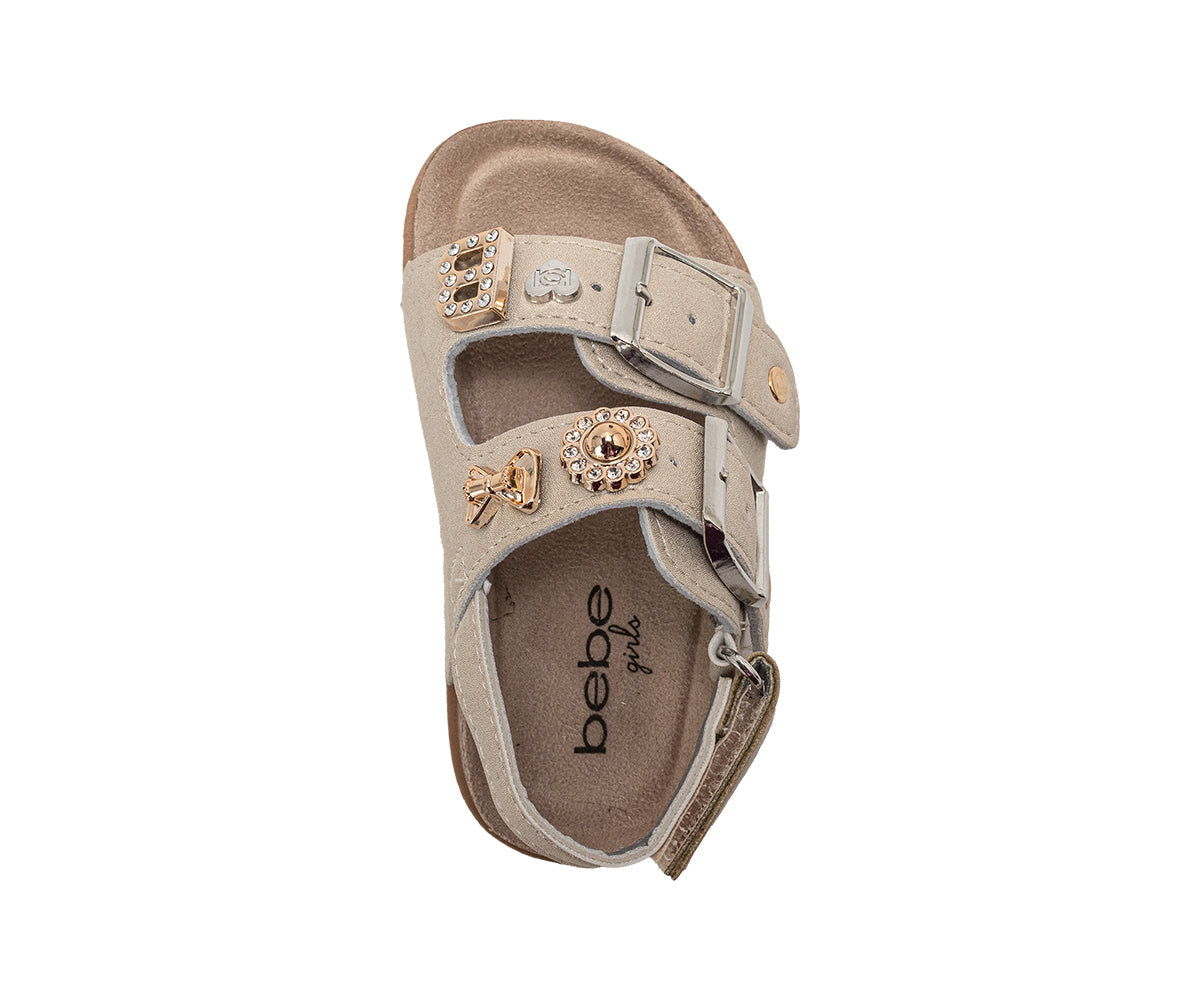 bebe Toddler Girl's Footbed Sandals & Comfortable Slip-On Summer Shoes with Buckles and Multi Charms