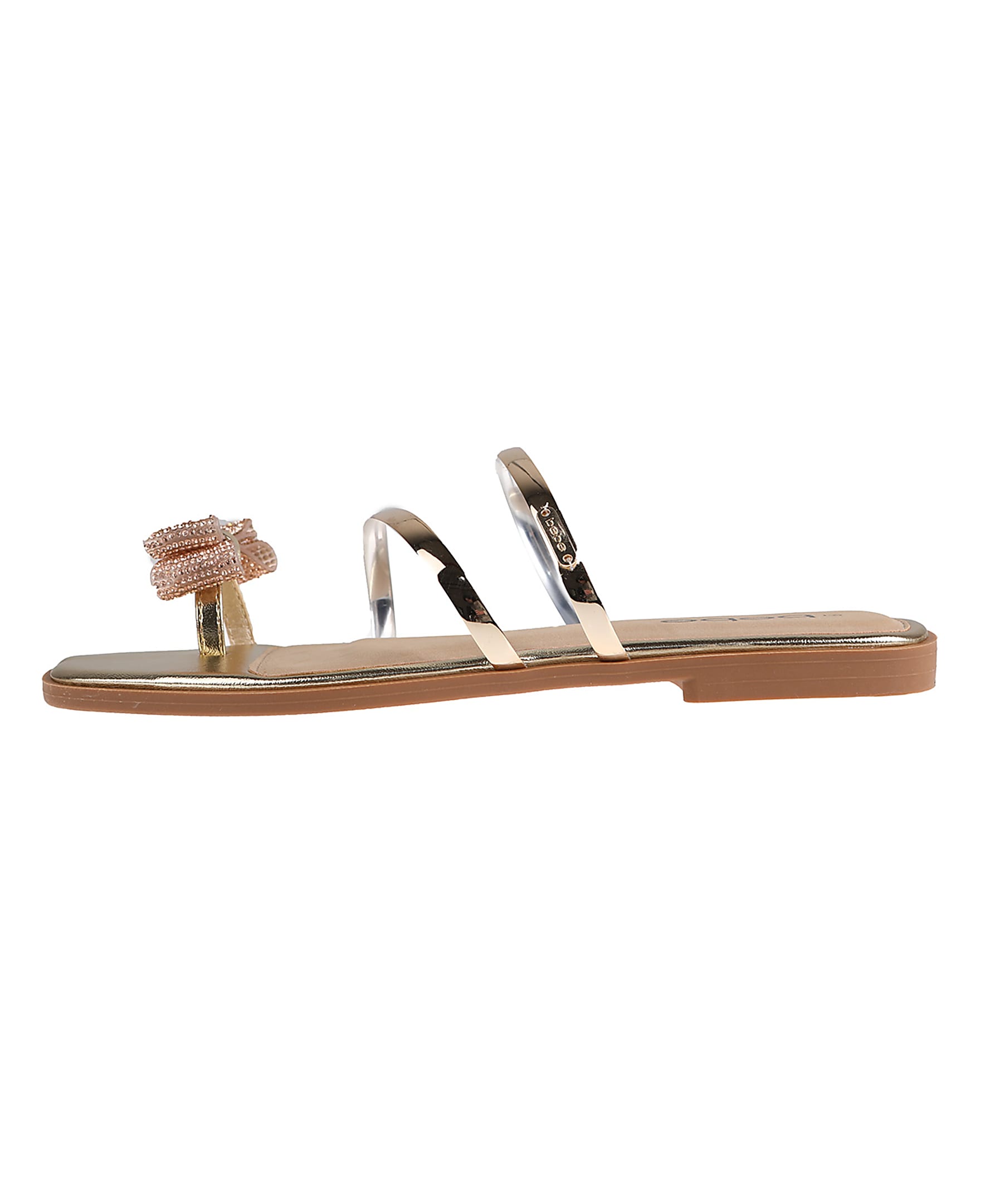 This women's sandal features a stylish bow detail with sparkling embellishments. The sleek straps and open-toe design make it perfect for any occasion. Comfortable and versatile, it's great for casual or dressy outfits.