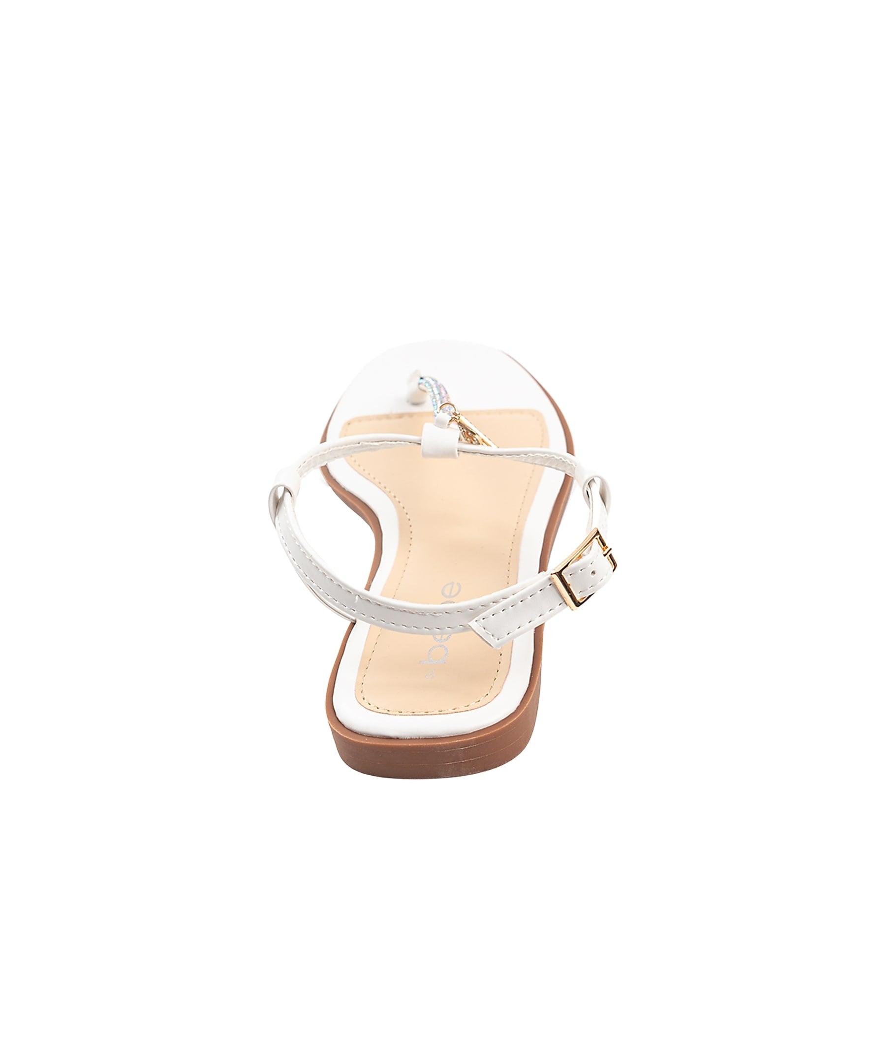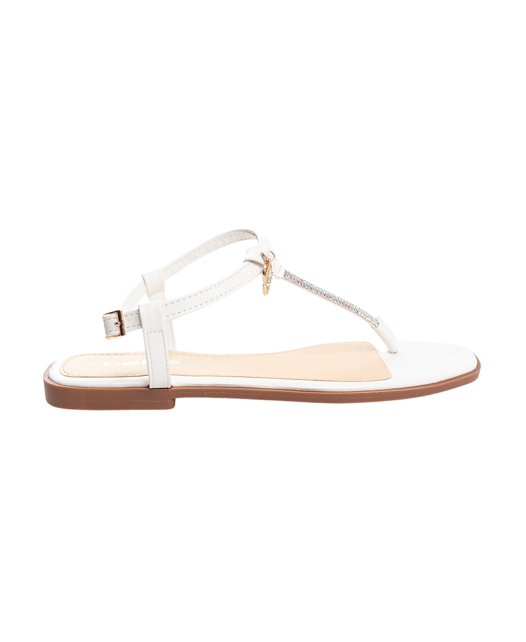This women's sandal features a stylish T-strap upper with sparkling rhinestones for a touch of glamour. It also has double B dangle charms that add a fun, unique detail. The sandals are comfortable and provide a secure fit, making them perfect for summer events or casual outings.